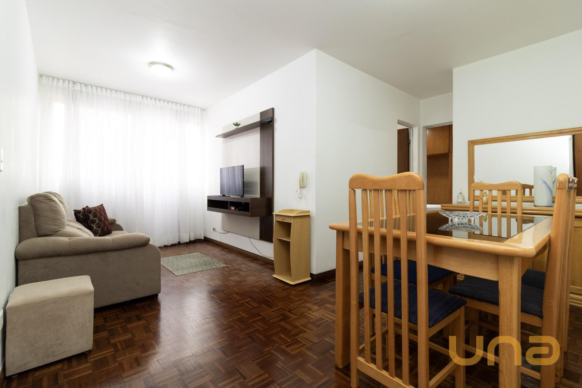 Sala ampla para dois ambientes, já mobiliada com sofá, puff, mesa com cadeiras, rack, painel, TV, interfone, cortinas, luminárias e espelho de parede, além de tela de proteção nas janelas. Piso parquet preservado e excelente aproveitamento de espaço.