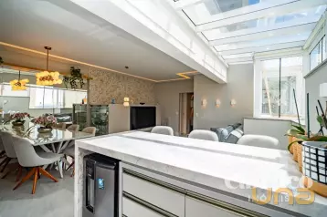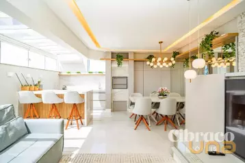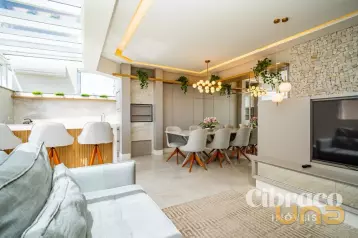 Distribuição dos Ambientes: Primeiro pavimento possui sala de estar e jantar integradas, com mobiliário completo (sofá, mesa com cadeiras, projetor, aparador, lustre e cortinas), lavabo, cozinha com armários planejados e eletrodomésticos, lavanderia com armários e banheiro de serviço, dois terraços, sendo um deles com banheira tipo spa e churrasqueira a carvão, e outro menor.